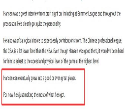 这家媒体对杨瀚森还是很有信心,认为他最终有望成长为一名优秀甚至顶尖的球员。就目前而言,他只是在充分利用现有条件,尽力做好当下能做的事。
