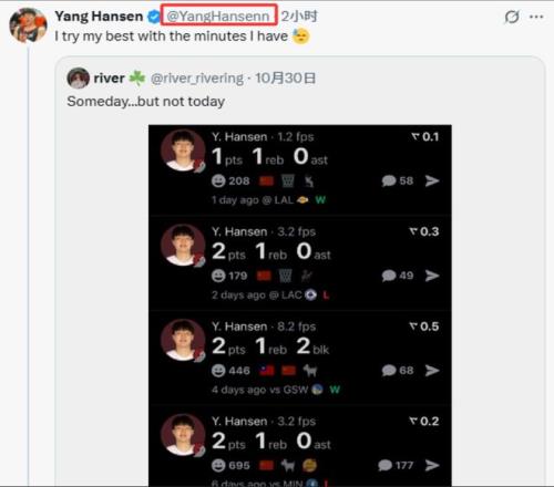 这个“杨瀚森”在社媒上写道:“我会在获得的时间里拼尽全力。”他回应的是一个列有他开季数据的帖子。赛季至今的5场比赛,瀚森场均1.8分,投篮命中率22.2%,5场得分依次是2分、2分、2分、1分、2分。