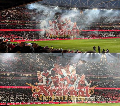 该Tifo下端写有“这是我们的地盘。(The streets are our own)”。据悉这一句歌词来源于阿森纳球迷赛前经常咏唱的歌曲《永远的北伦敦》。