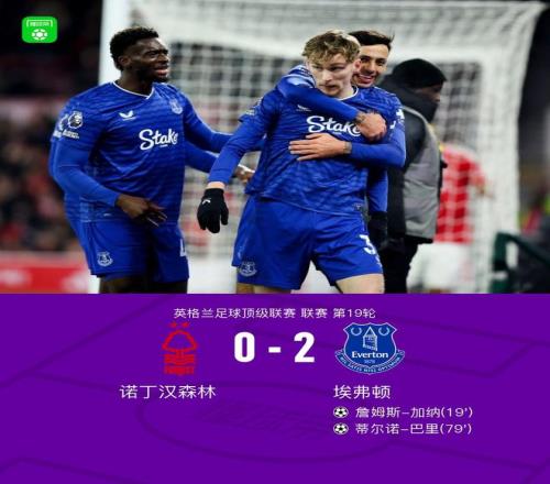 埃弗顿客场20诺丁汉森林,加纳传射建功,巴里破门